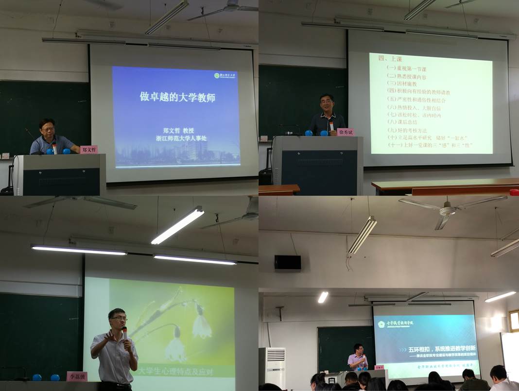 8月27日至8月31日,新任教师在浙江师范大学听取了系列专家报告,内容包括浙江师范大学人事处处长郑文哲教授的“铸就卓越的大学教师”、教务处处长赵雷洪教授的“促进师生共同发展的学业评价”、浙江师范大学徐秀斌教授的“如何上好一堂课”、宁波大学科学技术学院李荔坡博士的“大学生心理发展特点及应对”、金华职业技术学院教务处处长张雁平教授的“五环相扣,系统推进教学创新”等。浙江师范大学智慧教育研究院黄立新副院长和阮高峰副教授结合实际教学案例,展示了当代教学中信息技术支持的教学创新、网络教育以及移动学习的趋势。
