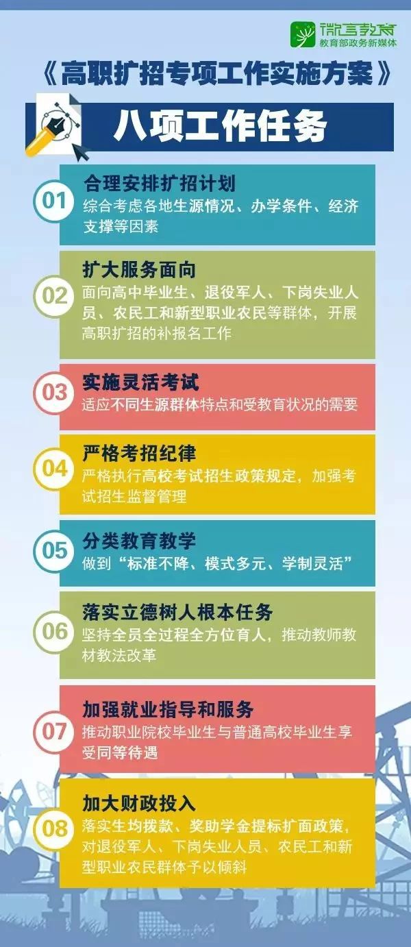 王继平介绍说,此次扩招工作扩大了服务面向,覆盖高中毕业生、退役军人、下岗失业人员、农民工和新型职业农民等群体。同时,“取消高职招收中职毕业生比例限制,允许符合高考报名条件的往届中职毕业生参加高职院校单独考试招生。