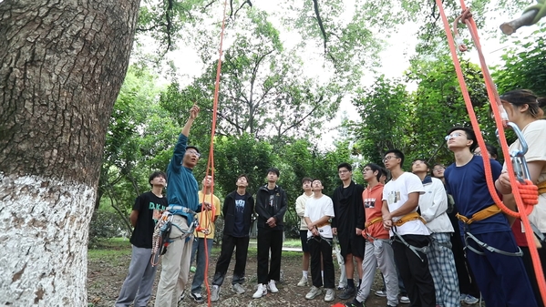 为了上好攀树课,张督成没少花心思。每节课上,正式实践前,都需讲解相关理论知识。张督成发现,如果照本宣科,不出5分钟学生就会觉得枯燥。怎么才能让学生听得进去?张督成冥思苦想,琢磨出一个好办法——自创武功招式解读攀树流程。“比如,建‘保护站’需要上抛、连接各种绳索,我就起名‘穿针引线’。‘正式攀树’是第二式‘身轻如燕’,‘回收装备’叫‘宝剑归鞘’……”知识变得如此生动,学生们一下就来了兴趣,理论课上也坐得住板凳了。