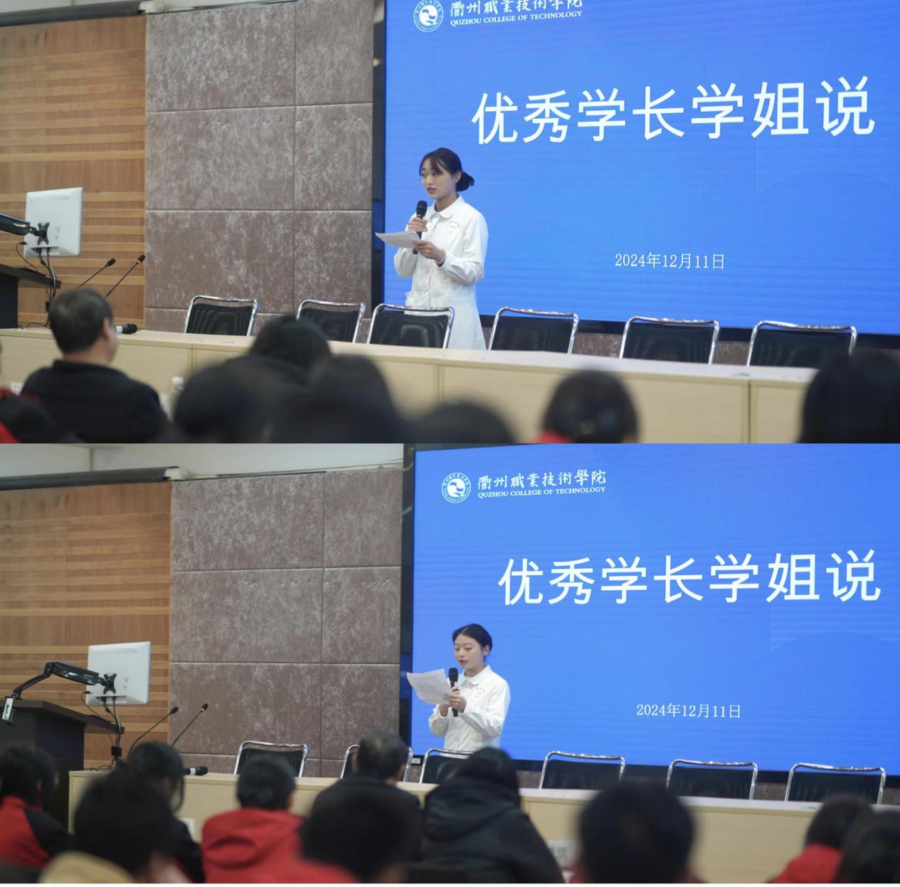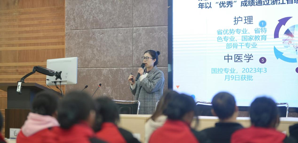 医学院护理专业教师向来校师生介绍了我校概况、护理专业课程学习、职业规划及健康生活等方面内容。衢州护士学校毕业的我校24级新生谢婷婷、王琴同学分享了入学衢职以来的学习生活心得,并就学弟学妹关心的问题进行了现场解答。