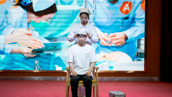 2025年护理技能大赛获奖团队带来“护梦启航·技绽芳华--护理技能展示”。在10分钟的情景模拟中,她们将包扎、海姆利克急救法和心肺复苏三项核心技能依次呈现。面对“意外受伤”的“患者”,她们迅速反应,手法娴熟地完成伤口清创、精准包扎,每一个结扣都紧实而有序;当遭遇 “气道异物梗阻” 时,她们立即运用海姆利克急救法,用规范的动作帮助“患者”排出异物;在模拟“心脏骤停”的场景时,她们沉着冷静,整套心肺复苏操作一气呵成,按压频率与深度精准无误。她们用专业与专注诠释着护理工作者守护生命的决心,每一个动作都饱含着对生命的敬畏。