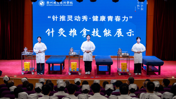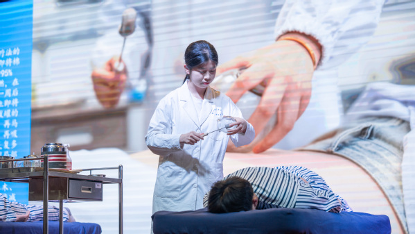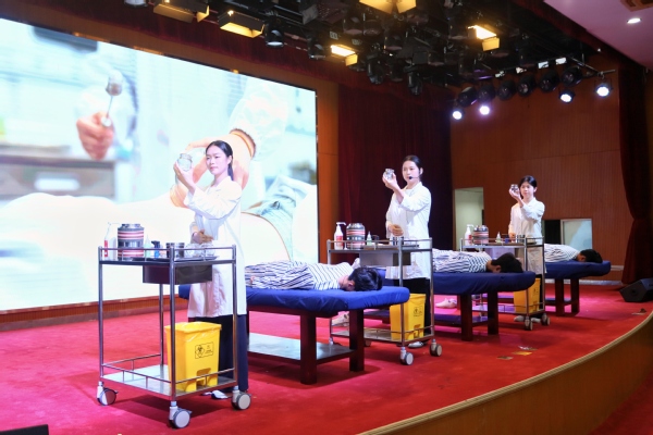 活动在针灸推拿专业学生团队带来的《针推灵动秀·健康青春力》拔罐技能展示中拉开帷幕。同学们以专业精准的理疗手法、亲切温和的人文关怀,逐一展示了闪罐、滚罐和走罐操作,彰显了传统中医的博大精深和无穷魅力。