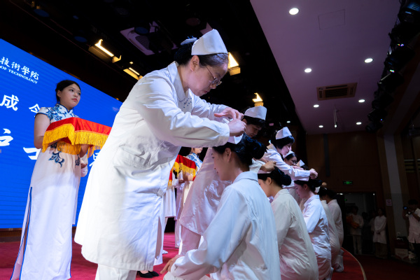 在悠扬而庄重的音乐声中,“冠成今日・爱佑终生 —— 护士加冕礼”温情上演。24级护理专业学生依次上台。护理前辈们亲手为她们戴上象征圣洁与使命的燕尾帽,传递承载希望的烛火。在领誓人刘瑞芳的带领下,新一批护生庄严宣誓,铿锵有力的誓言回荡在现场,字字句句饱含着对护理事业的忠诚与热爱。这一刻,她们正式接过守护生命的接力棒,将以坚定的信念和无私的奉献,踏上神圣的护理征程。