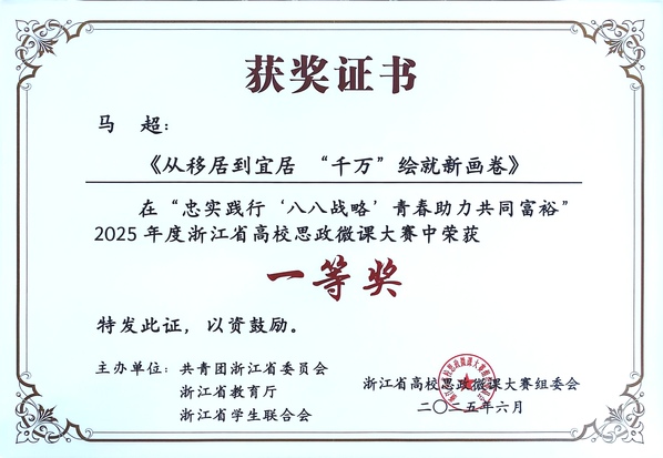 近日,由共青团浙江省委、浙江省教育厅、浙江省学生联合会主办的2025年度浙江省高校思政微课大赛决赛圆满落幕。我校师生斩获一等奖2项,三等奖3项。校团委马超老师微课作品《从移居到宜居 “千万”绘就新画卷》与经济管理学院学生夏塽微课作品《新农具开新局 小镜头映大业——村播点亮乡村振兴路》(指导老师:韩瑞鑫、赵慧慧)分别荣获教师组和学生组一等奖,继续保持了我校在全省思政微课大赛中的良好成绩。