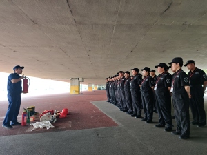 7月17日上午,一场“不打招呼”的反恐防暴演练在西门骤然打响:一名“可疑人员”持刀试图翻越强行闯入校园,值班安保人员第一时间触发一键报警,3分钟内,巡逻人员携带防暴钢叉、盾牌迅速集结形成包围圈,最终“可疑人员”被制服移交警方。除了“对抗式”演练,技能培训同样“干货满满”。市巡特警支队教导员通过“情景模拟+动作分解”,手把手教授安保人员如何利用防暴器械形成“三角阵型”控制局面;智慧新城消防救援大队教官现场教授消防设备使用,演示灭火器“提、拔、握、压”四步操作法,并组织参训人员用模拟火源反复练习;医学院相关老师则开展了心肺复苏等技能培训。