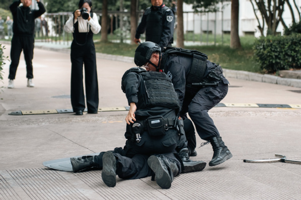 反恐防暴演练开始,一辆社会车辆从西门冲入我校,被我校安保人员用车辆阻断器逼停至二号公寓前,两名社会闲散人员拿出随身携带刀具下车开始威胁校内学生,我校保安与其一直周旋,接警赶到的特警人员口头警告歹徒,歹徒毫无收敛之意继续用刀砍特警人员,在特警人员武力压制下,歹徒被制服,特警迅速将歹徒抬离现场。